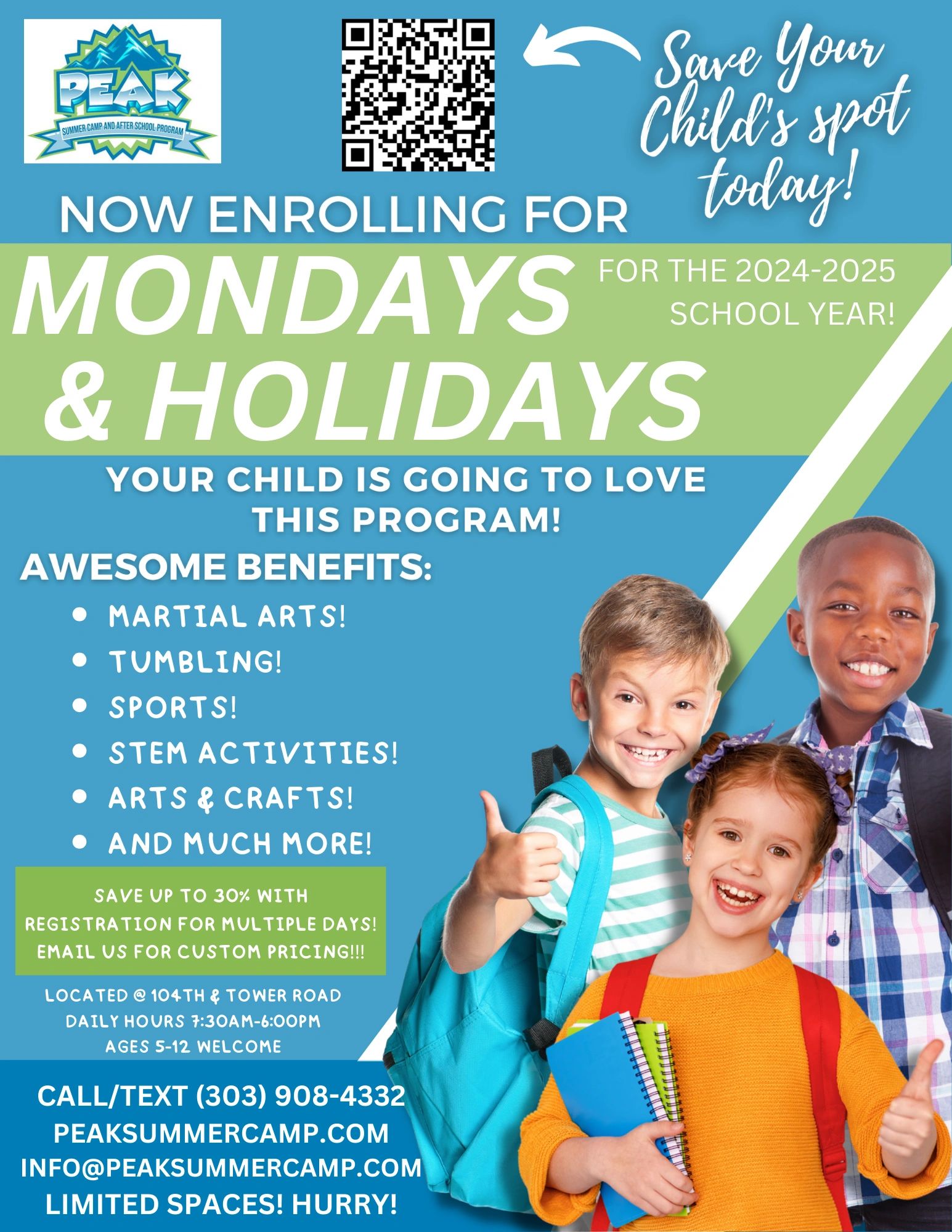 To support students in the Brighton 27J School District, Peak offers camp every Monday from 7:30am-6:00pm!